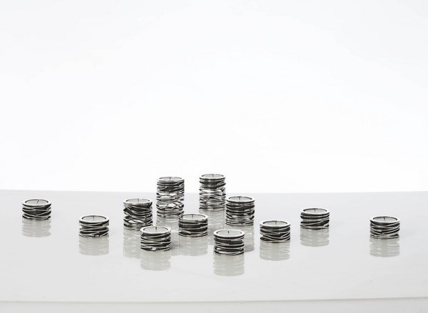 Guldsmedens Lysestage blev erhvervet af Museet på Koldinghus i 2010. Det tog sin tid at skitsere og lave modellerne. Jeg tegnede, klippede i pap og klistrede kugler på. Stabler af skiver lå alle vegne. Ind imellem gik jeg tilbage til min vante metier, og ”udførte lysestagerne i smykkeformat”. Halssmykker blev det til, af små rondeller med kugler eller diamanter i. Alt blev stablet ovenpå hinanden, på en sådan måde, at man kunne dreje og lege med rondellerne, og smykket ville ændre sig en ganske lille smule. Jeg tog en dyb indånding – tog fat i sølv og sav. Satte passeren på pladen, og begyndte at save rondeller ud. Rigtig mange rondeller.